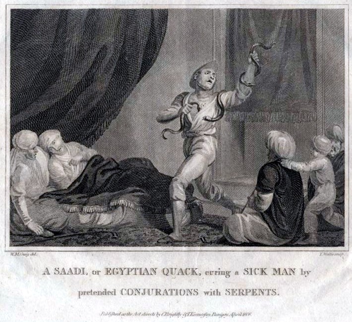 6. A Saadi or Egyptian Quack ![]() A SAADI, or EGYPTIAN QUACK, curing a SICK MAN by pretended CONJURATIONS with SERPENTS. Published as the Act directs by C. Brightly & T. Kinnersley, Bungay, April 1806. W.M. Craig del. T. Wallis sculp. Kobberstikk 170 x 120 mm. |
